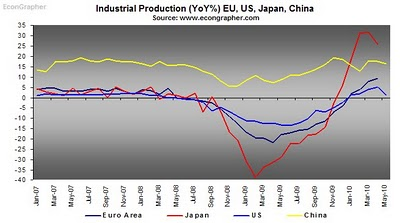 Industrial production figures released over the week showed no real surprises with the pattern broadly in line with the expected path from recovery. The US showed a deceleration in Industrial production growth as the comparator figure started to recover; still too soon to call a double dip but it will pay to watch the rest of the data. Japan also saw a slight deceleration in its industrial production recovery - as the trade dependent economy continues to rebound from the deep drops during the height of the crisis. The EU showed continued signs of recovery or renormalisation, and the China data - there for comparison showed continued strength. S Industrial Production has shown a period of deep contraction followed by short term recovery; the question is - where to next?