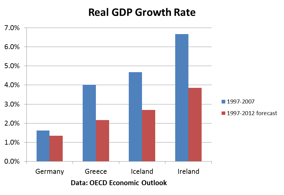 What is more surprising is that Greece, Ireland and Iceland continue to outperform Germany, even when we factor in the five years of the bust, including forecasts through 2012 (the red bar). For example, average real GDP growth in Iceland is projected to be 2.7% annually over the 1997-2012 time period, almost double the 1.4% growth rate of Germany.