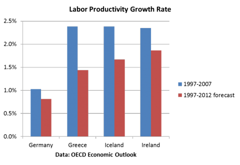 These charts show that the three basket-case countries of Europe - Greece, Ireland and Iceland - substantially outperform Germany during the boom years, which is to be expected (blue bars). For example, Greece had productivity growth averaging 2.4% per year from 1997 to 2007, compared to only 1% per year for Germany.